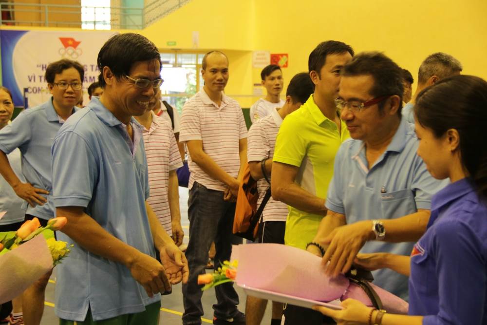 Ông Nguyễn Trọng Nam – Trưởng BTC tặng hoa cho các đoàn thể thao và tổ trọng tài trước trận đấu.