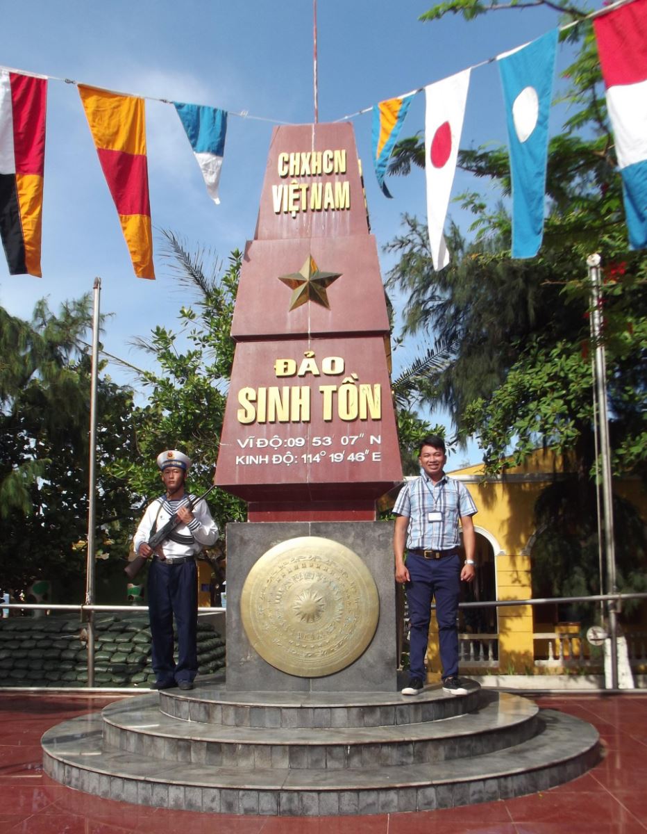 Đồng chí Lê Hồng Sông tự hào đứng cạnh cột mốc chủ quyền Tổ Quốc trên đảo Sinh Tồn