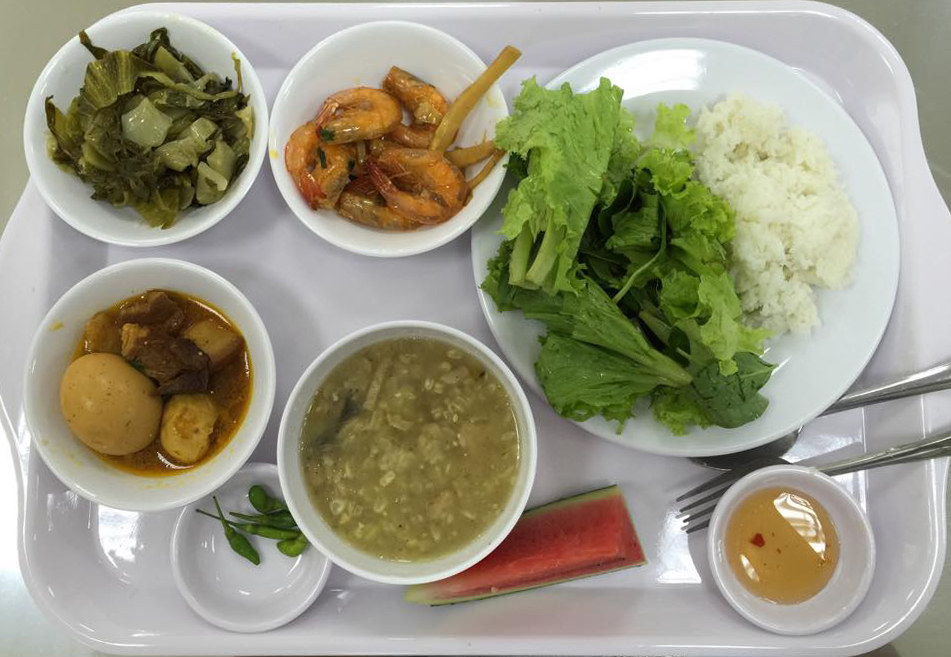 Mỗi suất ăn trưa sẽ có 2 món mặn, 1 món rau, 1 tô canh, rau sống và trái cây hoặc món tráng miệng. Chất lượng gạo ngon hơn hẳn các quán cơm bình dân và tại phòng ăn lúc nào cũng có sẵn trà đá sạch sẽ mát lạnh.