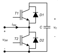 Về cấu tạo, bộ MMC được ghép từ nhiều mô-đun nhỏ gọi là các mô-đun đóng cắt switching module (SM). Cấu hình SM đầu tiên và cũng được sử dụng rộng rãi trong các bộ MMC là kiểu bán cầu half-bridge (HB) như trên hình 2, bao gồm 2 IGBT, 2 diode và một tụ điện. SM BẬT khi T1 BẬT và T2 TẮT (Bảng 1), SM TẮT khi T1 TẮT và T2 BẬT. Khi SM BẬT, điện áp SM giống với điện áp tụ điện, trong khi nó TẮT, điện áp bằng không.