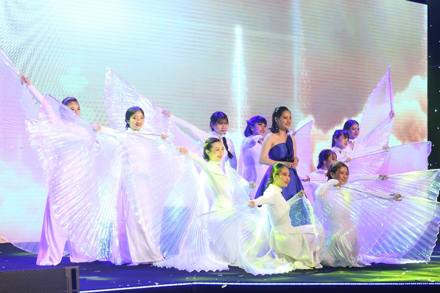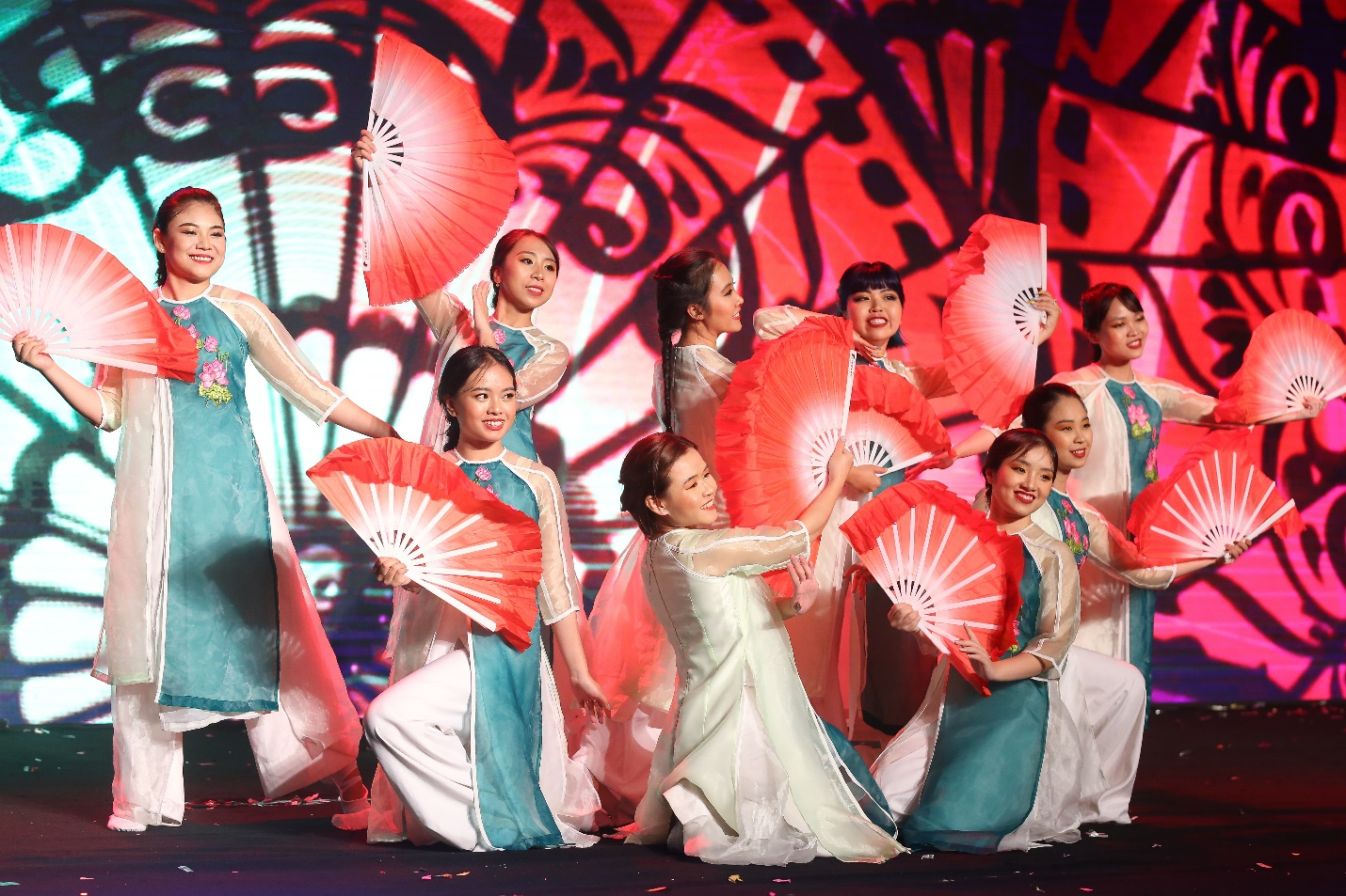 Các cô gái đến từ Đội văn nghệ PECC2 mang đến tiết mục múa quạt trên nền nhạc hòa tấu