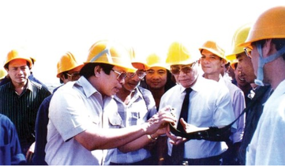 Cố Thủ tướng Võ Văn Kiệt (đeo cà vạt) trên công trường đường dây 500 kV Bắc - Nam. (Trong ảnh: Ông Trần Viết Ngãi - Phó Trưởng Ban chỉ đạo công trình đường dây siêu cao áp 500kV Bắc - Nam, Tổng giám đốc Công ty Xây lắp điện 3 đang giới thiệu về thiết bị an toàn lao động với Thủ tướng). Ảnh: Toàn Thắng.