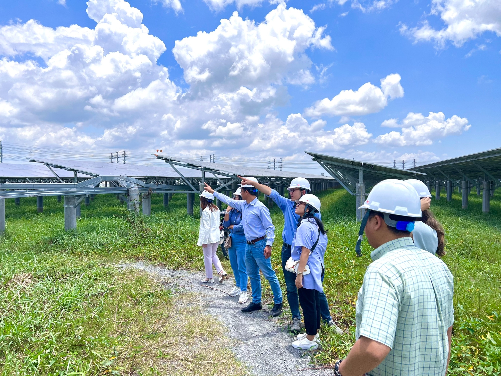 Đoàn công tác PLN được dẫn đi tham quan tại khu vực đặt các tấm pin mặt trời tại Nhà máy Điện mặt trời Dầu Tiếng 1.