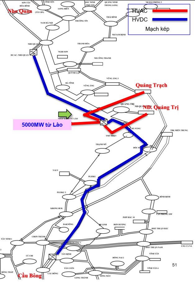 Trong điều kiện hiện nay, việc đầu tư thêm các đường dây HVAC để truyền tải công suất các nguồn điện nhập khẩu Lào là khó khả thi do phát sinh quá nhiều diện tích đất hành lang tuyến và giải phóng mặt bằng, cũng như các tác động xấu đến các yếu tố môi trường khác (tài nguyên thiên nhiên, đất rừng,...). Trong khi đó, hiệu quả đầu tư các phương án này chênh lệch không đáng kể. Mặt khác, với công nghệ thiết bị bán dẫn ứng dụng trong HVDC ngày càng tiến bộ, sẽ có xu hướng làm cho truyền tải HVDC hiệu quả hơn do xu hướng giảm chi phí đầu tư của trạm chuyển đổi AC/DC. Sau khi xem xét các phương án, báo cáo nghiên cứu phương án truyền tải HVDC do PECC2 lập cho EVN đề xuất cải tạo 1 đường dây 500kV HVAC 1 mạch hiện hữu từ Nho Quan đến Cầu Bông thành đường dây ± 500kV HVDC.