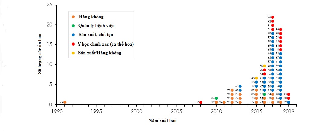 Sự phát triển của công nghệ song sinh số theo thời gian và lĩnh vực có thể được hình dung phần nào khi ta nhìn vào biểu đồ dưới đây (2). Biểu đồ thể hiện số lượng các bài báo khoa học về song sinh số trong các lĩnh vực tương ứng theo thời gian xuất bản (tính đến tháng 7/2019), được dày công thống kê bởi tiến sĩ Barbara Rita Barricelli và các đồng nghiệp. Các con số bên trong biểu đồ thể hiện số hiệu của mỗi tài liệu được đánh số bởi nhóm thống kê. Có thể thấy rằng, trong 4 năm gần đây song sinh số đang được chú trọng quan tâm trong lĩnh vực sản xuất và y học chính xác.