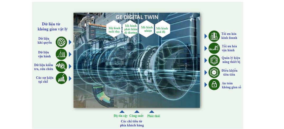 Trong số đó, bài viết này sử dụng ví dụ minh họa về song sinh số của General Electric (GE) là nơi phát triển công nghệ song sinh số nhà máy điện khá sớm, từ trước 2016. GE đã đưa ra mô tả song sinh số cụ thể cho nhà máy điện, như được thể hiện trong hình và diễn giải dưới đây (5):