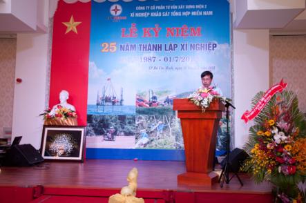 Ông Nguyễn Tiến Đạt – Phó Giám đốc Xí nghiệp đã ôn lại lịch sử hào hùng của Xí nghiệp. Khởi đầu từ lực lượng khảo sát còn ít và mỏng được rèn luyện từ công trình thủy điện Hòa Bình, các kỹ sư và công nhân lại được vinh dự giao nhiệm vụ khảo sát công trình Trị An - công trình thủy điện trọng điểm ở khu vực phía Nam. Trong suốt 25 năm, Xí nghiệp Khảo sát Tổng hợp Miền Nam đã vượt qua nhiều gian nan thử thách, vững bước đi lên khẳng định mình và phát triển không ngừng trong lĩnh vực Tư vấn khảo sát. Thương hiệu của Xí nghiệp được các đơn vị trong và ngoài ngành điện đánh giá cao với hàng loạt công trình điện và dân dụng được khảo sát chuyên nghiệp với chất lượng cao , nổi bật với những hạng mục công việc đòi hỏi yêu cầu thiết bị , công nghệ tiên tiến như đào hầm ngang khảo sát địa chất , thí nghiệm cơ địa trong hầm ngang, xuyên tiêu chuẩn SPT, xuyên tĩnh, xuyên động, khoan phụt xử lý nền móng và khoan kiểm tra bê tông đầm lăn RCC, v.v... .