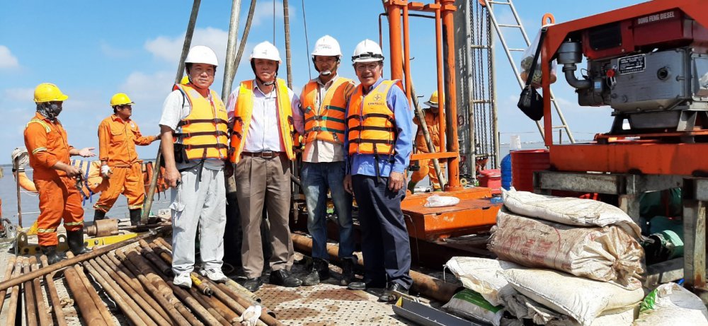 Ảnh: Ông Phạm Văn Luyện cùng đồng nghiệp khảo sát trên biển