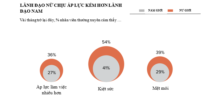 Không có gì đáng ngạc nhiên khi phụ nữ đảm nhận các vị trí quản lý cấp cao hơn có xu hướng cảm thấy kiệt sức, chịu áp lực làm việc nhiều hơn và “như thể họ phải trong trạng thái luôn luôn sẵn sàng làm việc”. Và số lượng nữ lãnh đạo nhiều gấp 1,5 lần nam giới phải suy nghĩ về việc giảm bớt vai trò của mình hoặc không tiếp tục công việc vì đại dịch COVID-19. Gần ba phần tư lãnh đạo nữ chỉ ra rằng kiệt sức là lý do chính.