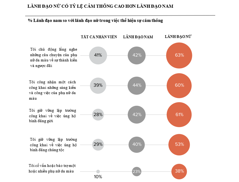 Kết quả về tài chính là điều quan trọng đáng chú ý. Báo cáo nghiên cứu cho thấy rằng lợi nhuận của công ty và triển vọng cổ phiếu có thể cao hơn gần 50% khi phụ nữ được thể hiện tốt vai trò của mình ở cấp cao nhất. Ngoài ra, phụ nữ giữ vị trí quản lý cấp cao còn có tác động lớn và có ý nghĩa đối với văn hóa của công ty. Họ có nhiều khả năng hơn nam giới trong việc thực hiện các chính sách và chương trình giúp các nhân viên gắn kết hơn và ủng hộ sự đa dạng về chủng tộc và giới tính: hơn 50% phụ nữ đảm nhận các vị trí quản lý cấp cao cho biết họ luôn có quan điểm rõ ràng về bình đẳng chủng tộc và giới tính tại nơi làm việc, so với khoảng 40% lãnh đạo nam. Và họ có nhiều khả năng cố vấn và bảo trợ cho những phụ nữ khác: 38% phụ nữ đảm nhận các vị trí quản lý cấp cao hiện đang cố vấn hoặc bảo trợ cho một hoặc nhiều phụ nữ da màu, so với chỉ 23% nam giới đảm nhận các vị trí quản lý cấp cao.