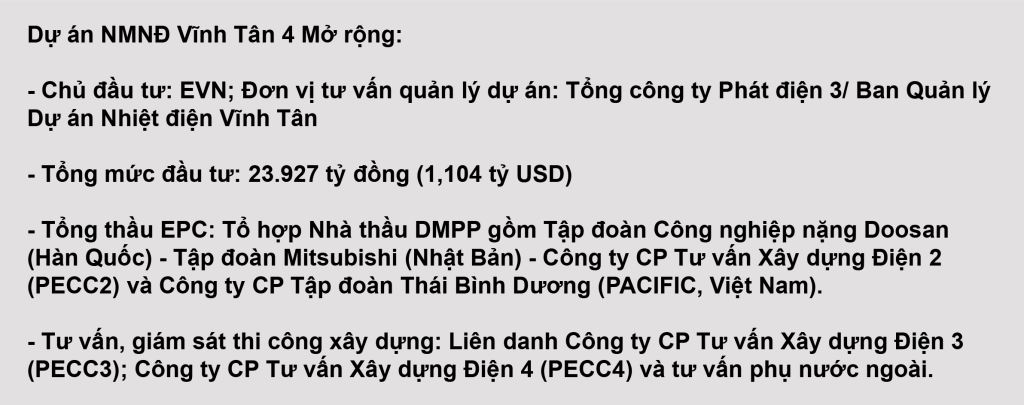 Dự án NMNĐ Vĩnh Tân 4 Mở rộng gồm 01 tổ máy với quy mô công suất khoảng 600 MW, sử dụng công nghệ lò hơi thông số siêu tới hạn (Super Critical). Dự án được chính thức khởi công vào ngày 23/4/2016.