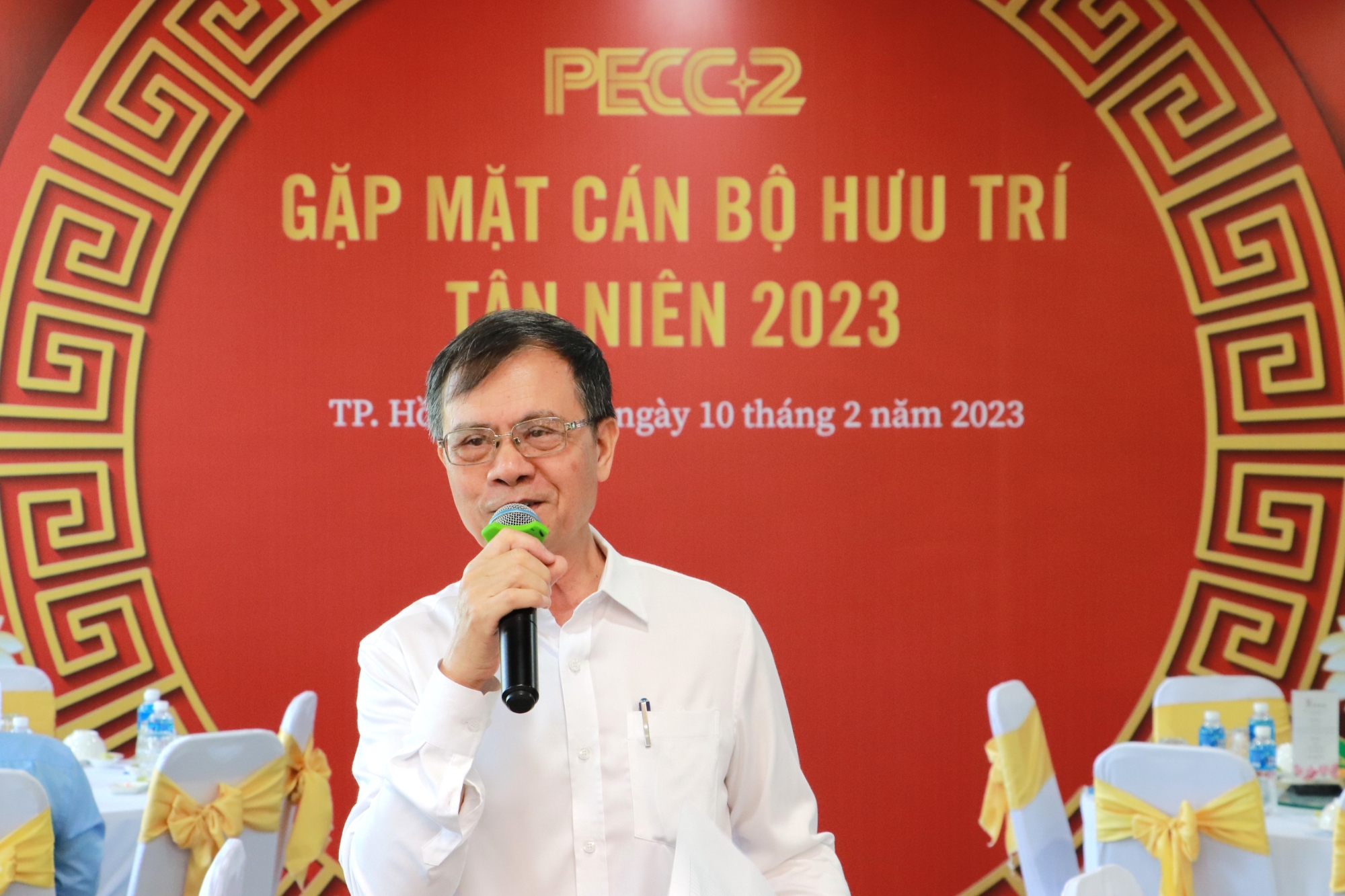 Phát biểu khai mạc chương trình, Ông Võ Văn Bình - Tổng Giám đốc PECC2 - gửi lời chúc sức khỏe, bình an và chúc mừng năm mới đến các cán bộ hưu trí. Ông rất vui mừng và cảm động khi các cán bộ, mặc dù đã về hưu, nhưng vẫn sắp xếp thời gian trở về và tề tựu đông đủ tại PECC2 nhân dịp đầu Xuân Quý Mão.
