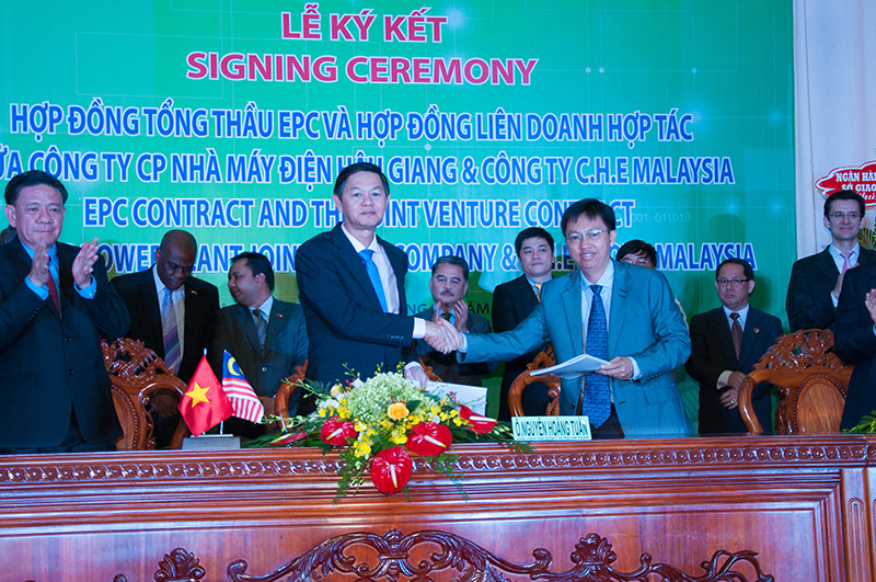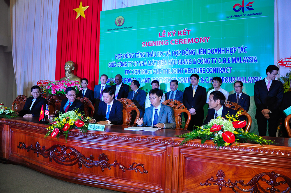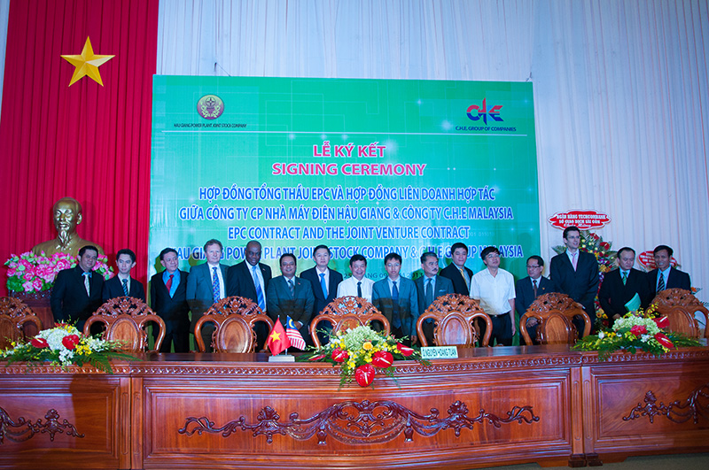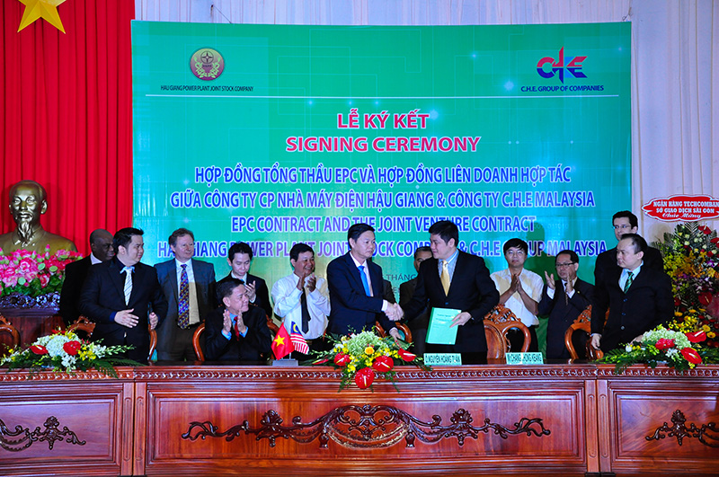 At 9:00 A.M. in the morning of September 25 2013, the signing ceremony of the three contracts was held at the meeting hall of Hau Giang’s Province People’s Committee between the Owner and partners in preparation for the construction of the Hau Giang rice husk–fired thermal power plant, expected to commence at the end of 2013 and on occasion of the ten-year ceremony of founding Hau Giang Province. The contracts include the EPC contract, the Joint Venture contract between Hau Giang Power Plant (HGPP) and C.H.E. (Malaysia) and the Contract of Consulting Service and Construction Supervision between HGPP and Power Engineering Consulting Joint Stock Company 2 (PECC2).