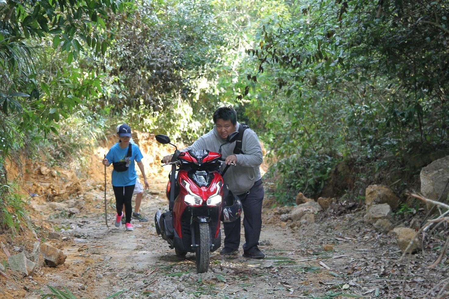 Mô tô của đội “săn ảnh” cũng phải rất vất vả để đuổi kịp bước chân của đoàn chạy.
