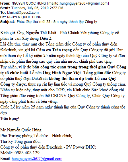 Phúc đáp thư mời 25 năm ngày thành lập Công ty