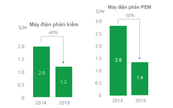 Giá bán máy điện phân kiềm ở Bắc Mỹ và Châu Âu giảm 40% từ năm 2014 đến năm 2019 là một ví dụ cho xu hướng này (3). Cũng trong giai đoạn 2014-2019, máy điện phân PEM do các nước phương Tây sản xuất ghi nhận sự giảm giá bán xuống còn 50% (từ 2.8 USD/W xuống 1.4 USD/W)(3).