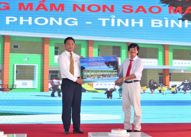 The EVN’s representative providing VND 5.2 billion to build eight new classrooms for Sao Mai kindergarten in Tuy Phong district