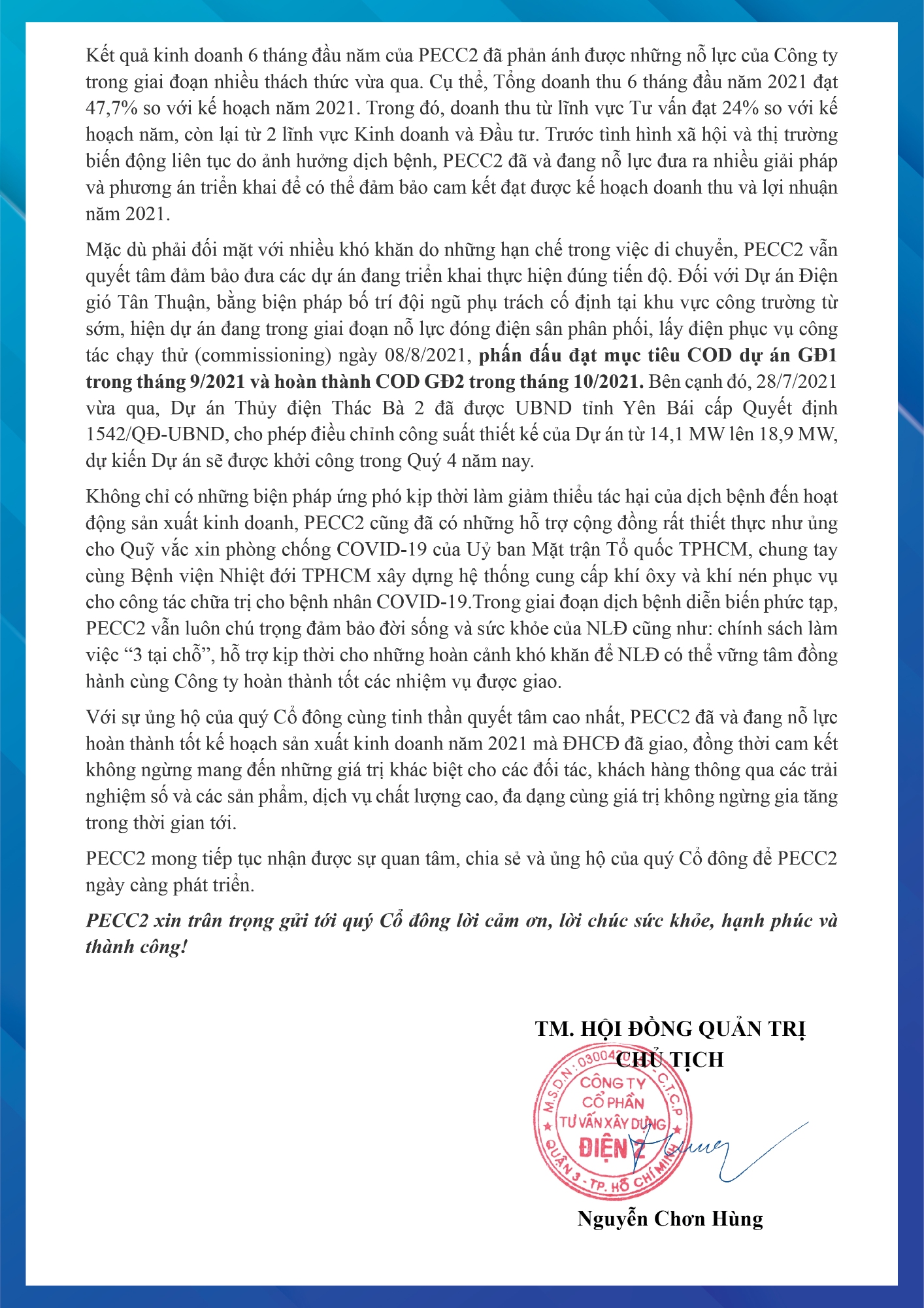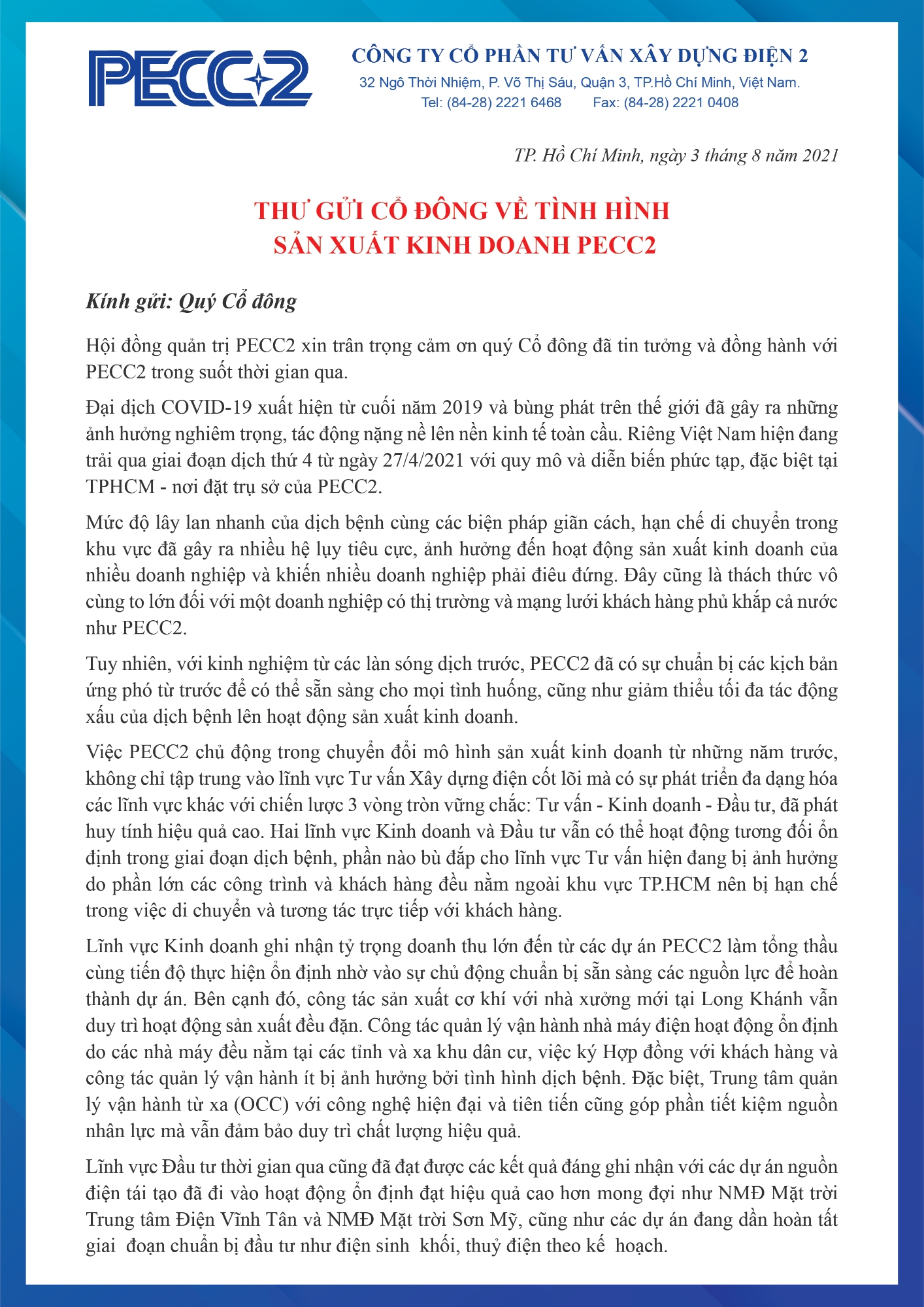 THƯ GỬI CỔ ĐÔNG VỀ TÌNH HÌNH SẢN XUẤT KINH DOANH PECC2